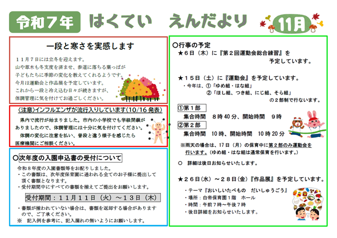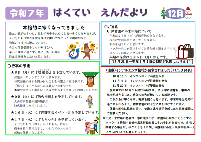 大きな大きな楠の木がある白帝保育園は、 専念寺の境内にある『みんなが家族のようにのびのびと過ごせる保育園』です。 自然豊かなこの犬山の土地で、嬉しいこと、楽しいこと、時には悔しいことを経験しながら、 思いやりのある豊かな心を持った子に育ってほしいと願っています。